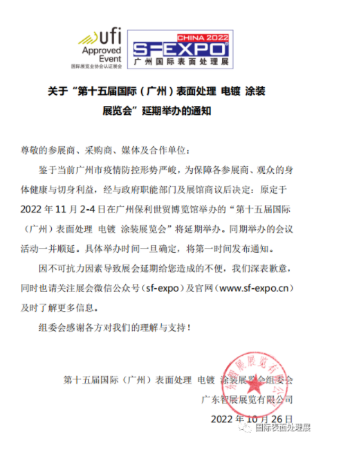當(dāng)前,鑒于全國疫情形勢嚴(yán)峻,廣東省內(nèi)呈多點(diǎn)散發(fā)態(tài)勢。為配合政府防疫工作需要,保障展商和群眾的生命財(cái)產(chǎn)安全,確保展會(huì)能夠順利安全出展,組委會(huì)對檔期進(jìn)行了統(tǒng)一安排調(diào)整,本計(jì)劃于2022年11月2-4日(周三-周五)舉辦“第十五屆國際(廣州)表面處理、電鍍、涂裝展覽會(huì)”將再次延期舉辦,具體時(shí)間會(huì)另行通知。